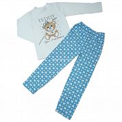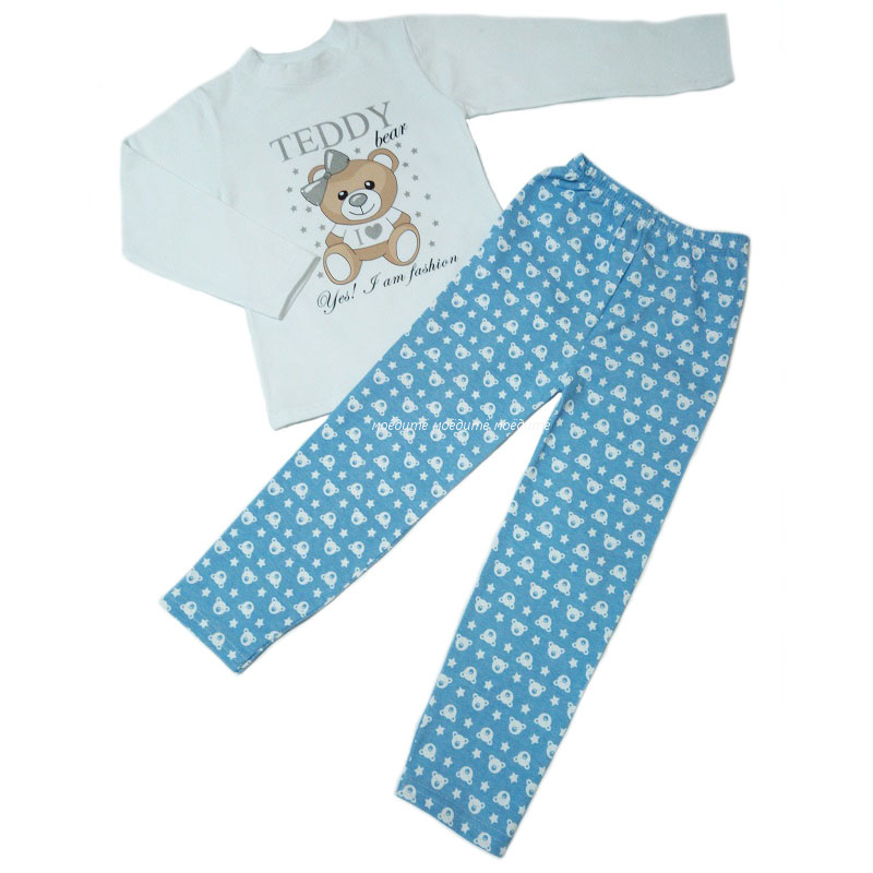 Костюм состоит из джемпера белого цвета без воротничка, с длинным рукавом без манжеты, спереди украшен рисунком мишки и штанишек на резинки с набивным рисунком по всему полю в виде мишек.